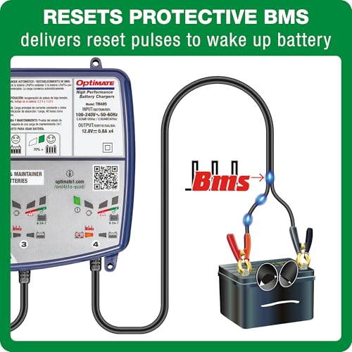 - Automatic wake up pulse for batteries with integrated BMS protection - After connection battery wakes up and charges. ; OptiMATE Lithium 24-7 smart inter-active maintenance prevents discharge from connected circuitry & more battery power, longer battery life!