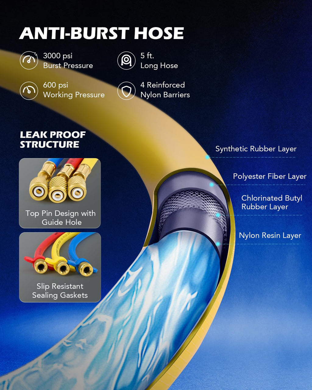 - COLOR-CODED HOSES: Blue for low, red for high, and yellow for charging, these PVC hoses have 4 reinforced layers to work with daily pressure up to 600 psi (3000 psi burst pressure)