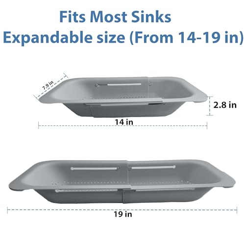- Adjustable & Space Saving - Collapsible colander can be conveniently expands from 14 to 19 inches to use over or in most sinks of different sizes. You can Customize it to your needs for a perfect fit in any sink or countertop. Over the sink strainer raises over the sink base to prevent drained water from backing up into your food. Designed to optimize kitchen space. Just tuck its collapsible handles for storage to maintain a clutter free kitchen.