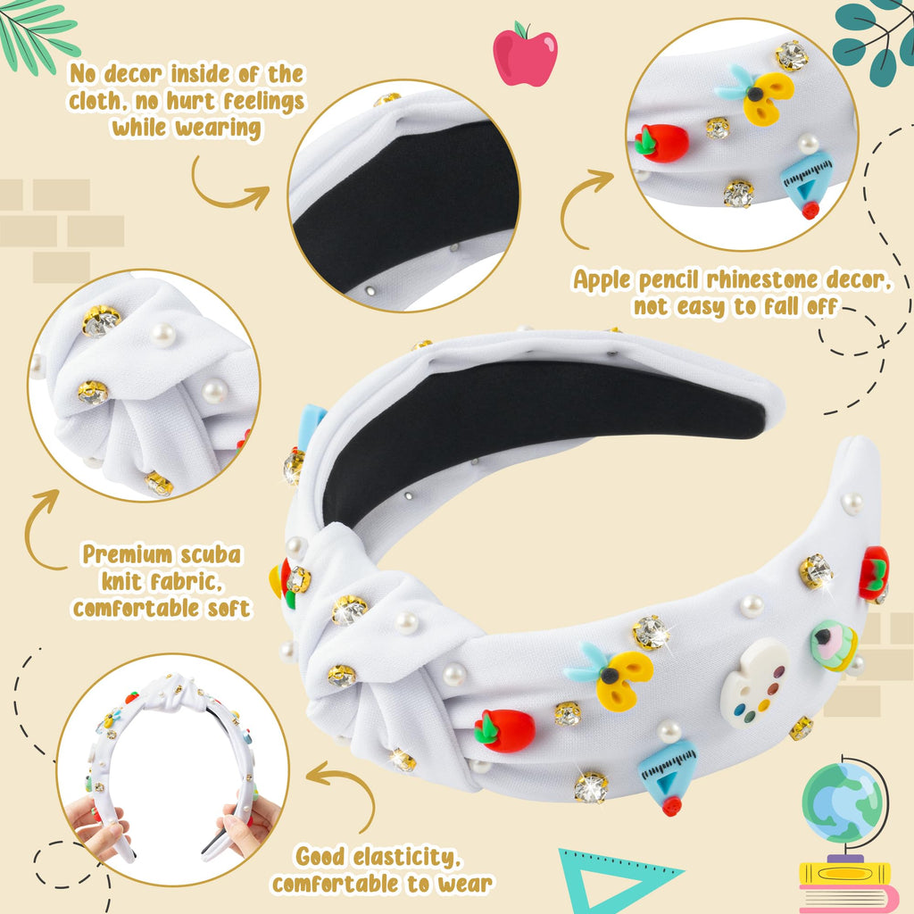 - GLAMOROUS STYLE: Make a dazzling statement with our teacher jeweled knotted headband. Quality fabrics, cute apple, pencil, ruler, scissors, drawing board and sparkling rhinestone crystal decor, add a touch of unique and sparkle to your hair accessories! This is the ideal choice to enhance your look, whether it's for a casual outing or a formal event.