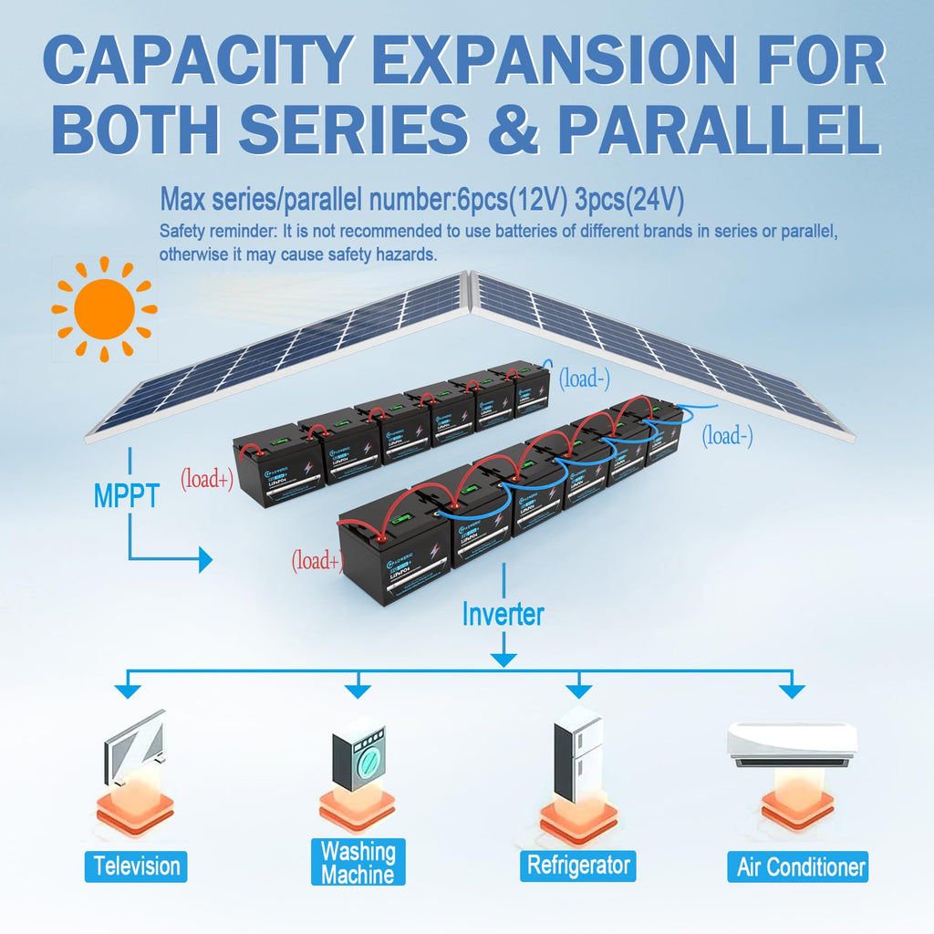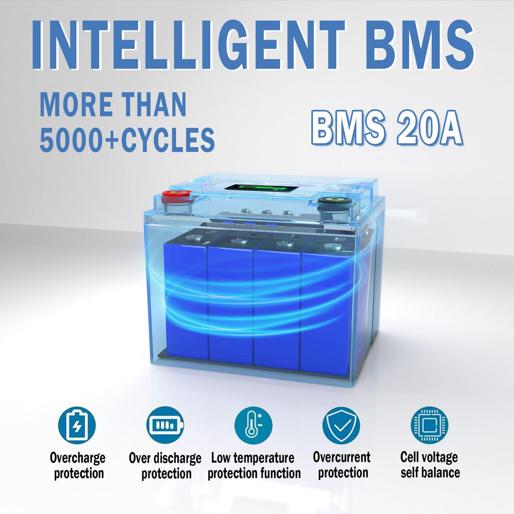 - 【Intelligent 20 BMS】12v 35Ah lithium battery has a built-in BMS, with over charge protection, over discharge protection and over current protection. Operating temperature: Charge at 0℃-45℃;Discharge at -20℃-60℃ . Tip: It is not recommended to use different brands of batteries in series or parallel, otherwise it is easy to cause safety risks. (Ensure that the voltage is consistent before series or parallel connection.)