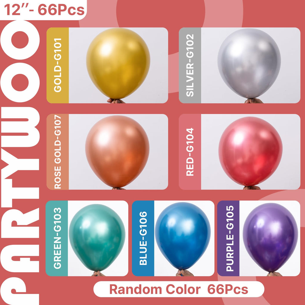 - Package includes: 66 pcs 12 inch colorful metallic balloons. in a solid consistent color that brings vibrant energy, can widely used in birthday, wedding decorations, baby shower decorations, and adding a vibrant touch to make your party bright