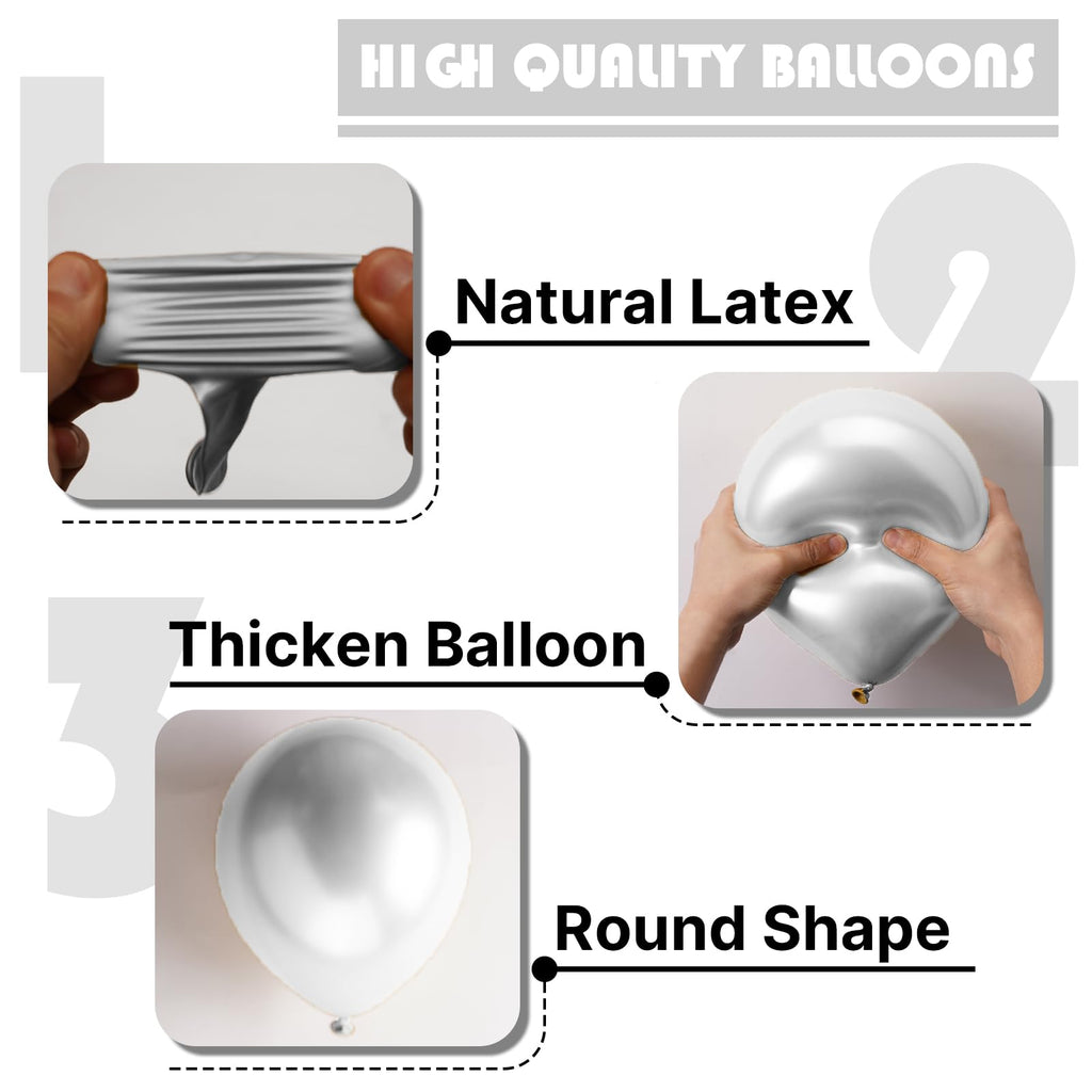 - EASY TO USE: Made from high-quality latex, these metallic silver balloons are easy to inflate with a hand pump or electric balloon pump. Ideal for birthday, graduation, and baby shower party decorations.