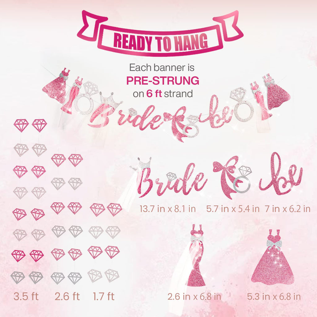 - Package includes: Package includes 1 piece of bride to be banner, 6 pieces of diamond garlands. Set the ultimate celebratory mood with this beautifully designed pink banner. It instantly creates a focal point for your bachelorette party or bridal shower