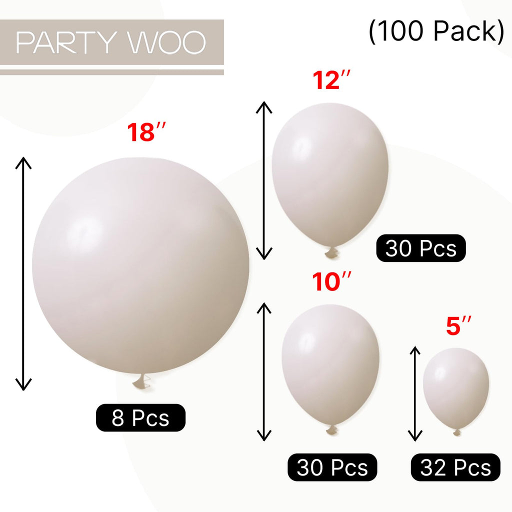 - 100 PCS WHITE SAND BALLOONS DIFFERENT SIZES: Package includes 18 inch balloons (8 pcs), 12 inch balloons (30 pcs), 10 inch balloons (30 pcs), 5 inch small balloons (32 pcs)