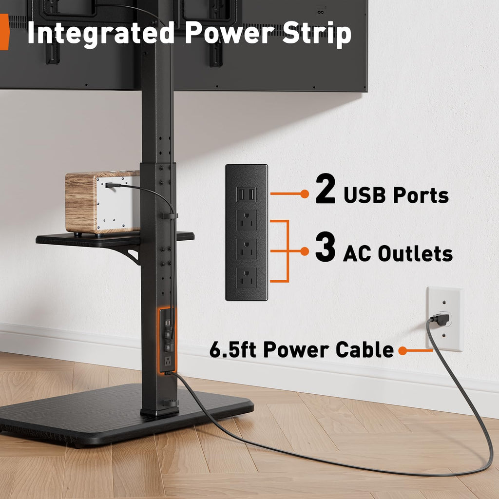- Integrated Power Outlet: The Perlegear floor TV stand is equipped with an integrated power outlet on the back with 2 USB ports (5V/2A), 3 AC outlets (120V/12A), and a 6.5 ft power cord. The TV stand can easily power multiple devices, ensuring a more streamlined look without the need for extra outlets or cables.