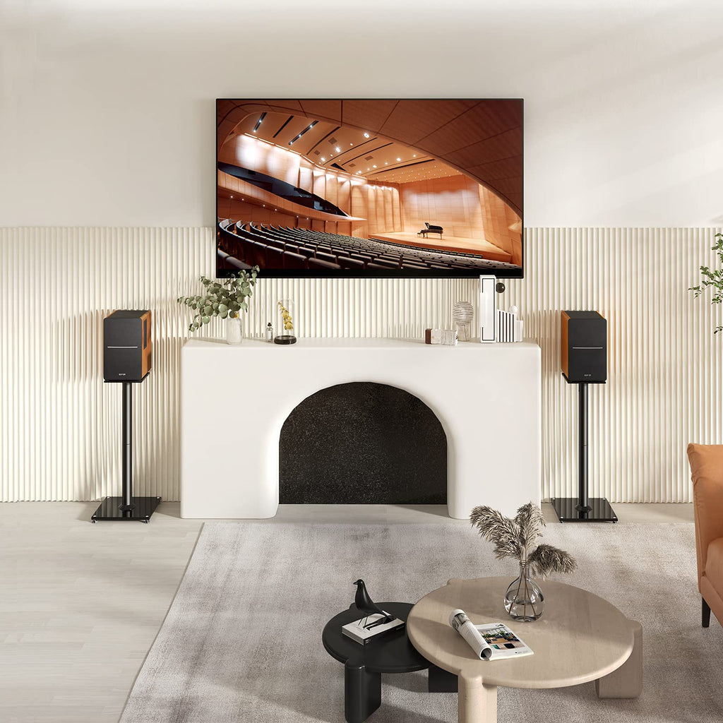 - 【Unique Noise Reduction Design】-The speaker stands came with two types of base feet. The protective rubber feet are made for marble or wooden floor while the metal feet will keep the speaker stands stay still on carpet. This speaker stand pair feature a delicate and elegant design which will goes well with any home style