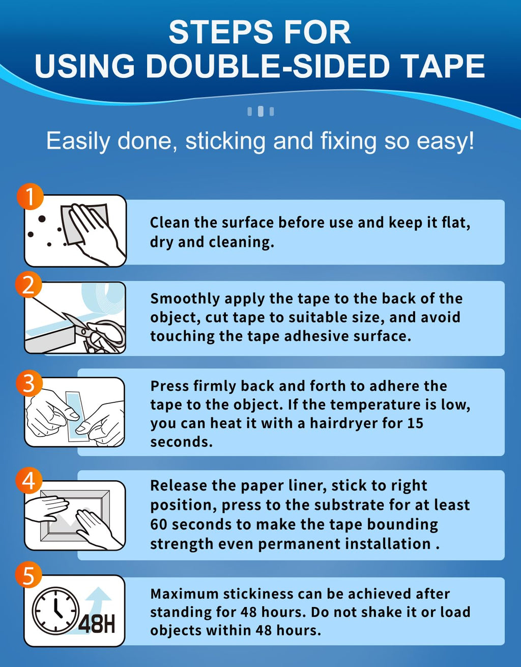 - 【Use Tips】1. Pressing: The greater the pressure, the stronger the stickiness. 2. Time: The longer the time, the stronger the stickiness, wait for 48 hours before hanging heavy object. 3. Temperature: When the construction temperature is low, please heat it with a hair dryer.