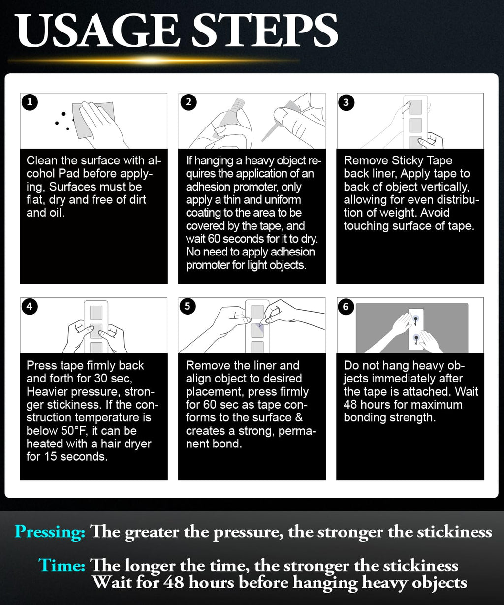 - 【Usage Tips】 1.Pressing: The greater the pressure, the stronger the stickiness. 2. Time: The longer the time, the stronger the stickiness. Wait for 48 hours before hanging heavy objects. 3. Temperature: When the construction temperature is low, please use a hair dryer to heat it up. The pressure-sensitive adhesive system of the sticky tape has high initial adhesion, ensuring rapid