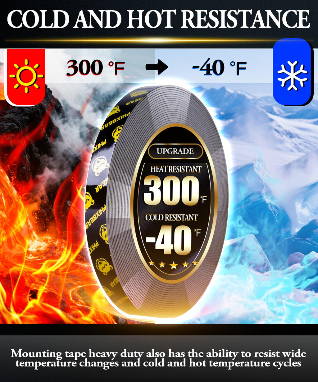 - 【Super High Temperature Resistance】 Heavy duty double sided mounting tape has excellent temperature resistance, capable of with standing high temperatures up to 300 ℉ (149 ℃) and low temperatures down to -40℉ (-40 ℃) in the short term and maintaining good adhesion at 199 ℉ (93 ℃) in the long term, allowing it to perform excellently in both indoor and outdoor environments. In addition, mounting tape heavy duty also has the ability to resist wide temperature changes and cold and hot temperature cycles, making it an ideal choice for various indoor and outdoor applications.