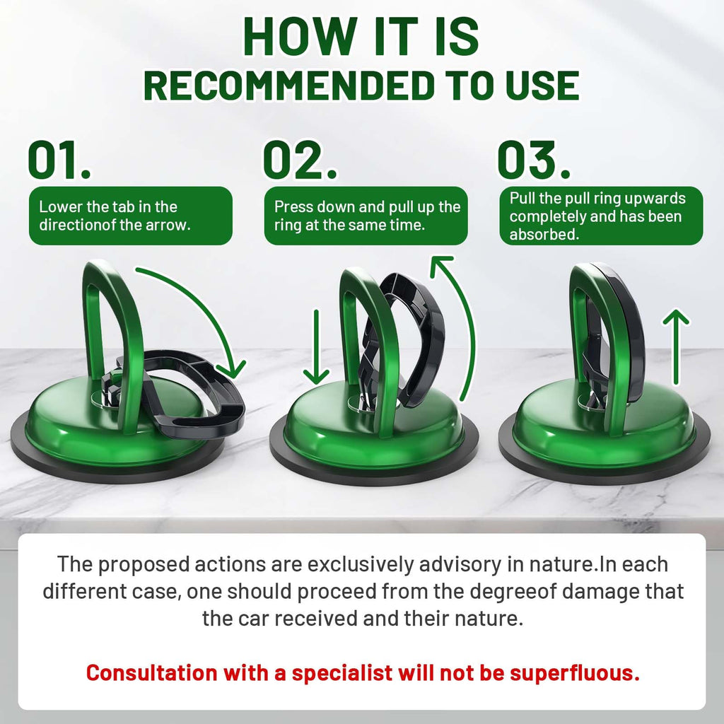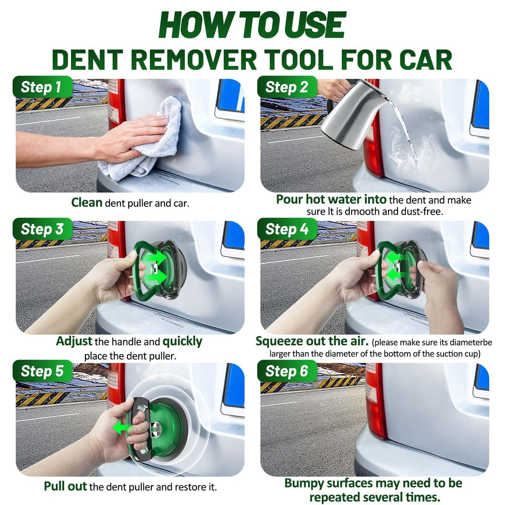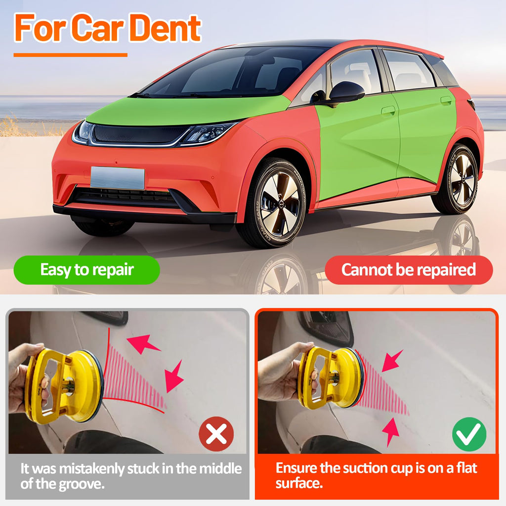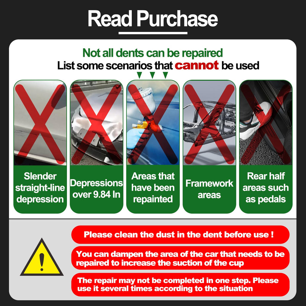 - 【Precautions】This aluminum alloy suction cup cannot repair all types of dents. Some scenarios where it cannot be used include: slender straight-line dents, dents with a diameter greater than 9.84 In, areas that have been repainted, framework areas, and rear half areas such as pedals. 1.Please clean the dust in the dent thoroughly before use. 2.You can dampen the area of the car that needs to be repaired to increase the suction of the cup. 3.The repair may not be completed in one step. Please use it several times according to the situation.