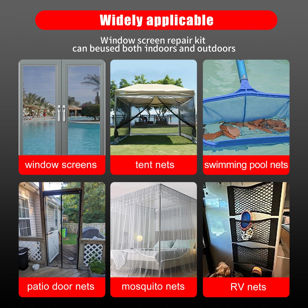 - 【Wide Application】The screen patch repair kit can be used both indoors and outdoors, including window screens, screen doors, tent nets, swimming pool nets, RV nets, patio door nets, vents or scratches and holes for cats and dogs, and can also prevent cockroaches, rats, flying insects, mosquito from disturbing you.