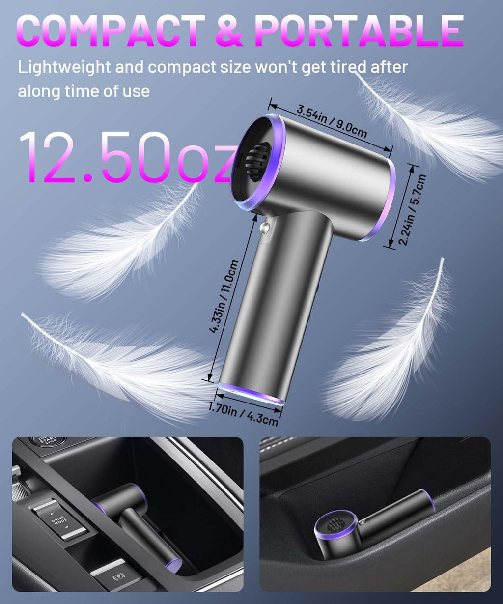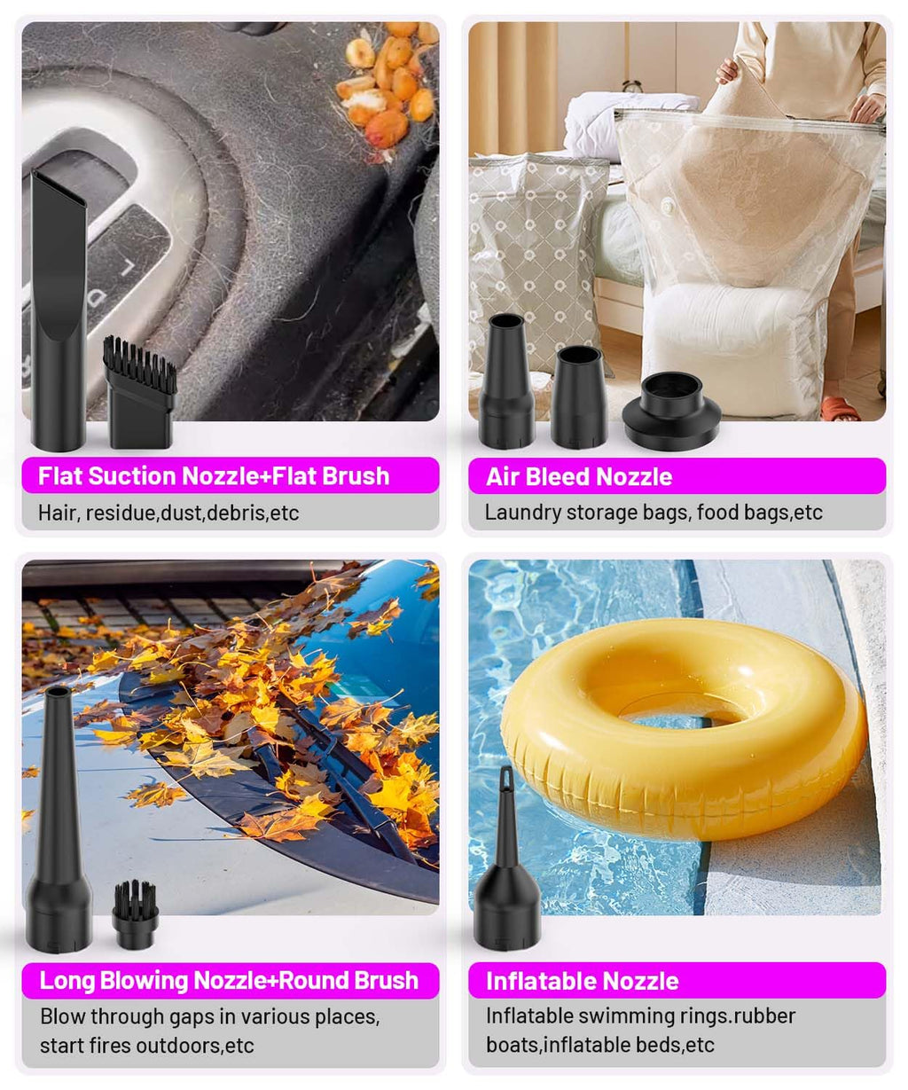 - [Greenlight Dust Detection Technology] High power vacuum cleaner for car with green light technology exposes every speck of hidden dust and pet hair, while the 15000Pa strong suction ensures a thorough clean. Handheld Vacuum cleaner used with 8 accessories can be used to get 4 modes of suction, blowing, inflation and vacuum compression to meet your different use scenarios