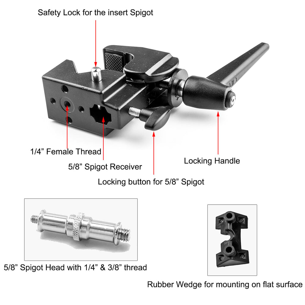 - Steel Metal construction: Solid Die-cast Aluminum Alloy Material, the clamp is strong and sturdy. Net weight of the photography clamp is 1.21 lbs / 0.55 kg, the super clamp can supports up to 33lbs / 15 kg load capacity