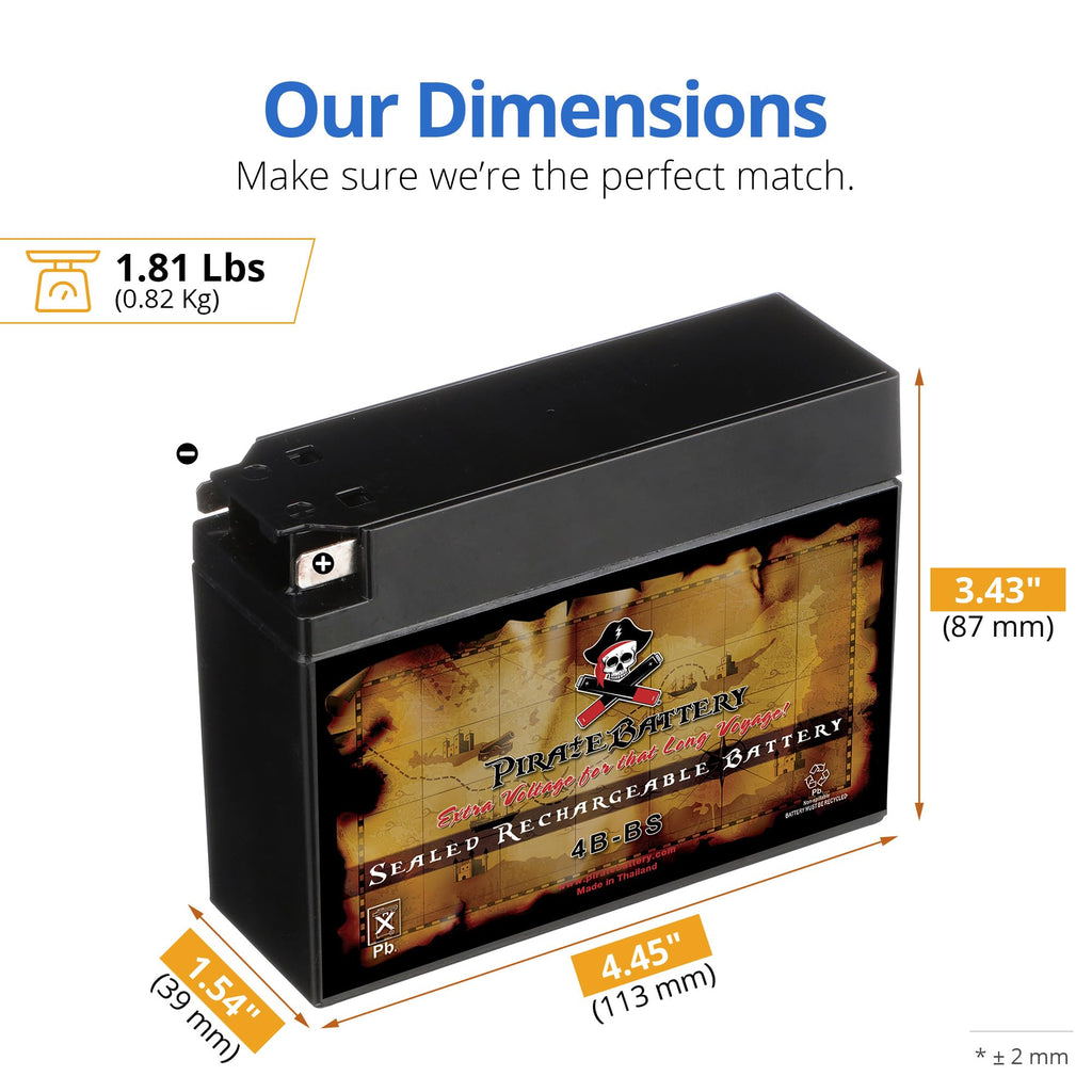 - YTX4B-BS absorbent glass mat battery; rechargeable battery that fits in a variety of applications; Dimensions: L(4.45in) x W(1.54in) x H(3.43in)