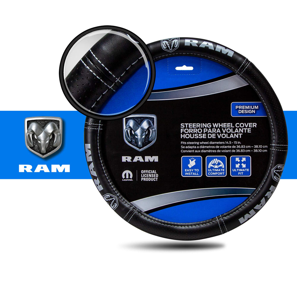 Details: Plasticolor’s Deluxe RAM logo deluxe steering wheel cover is built with quality and style. This Listing is for a 1pc Steering Wheel Cover. This steering wheel cover was designed to fit MOST vehicles; therefore, it will NOT fit steering wheels smaller than 14.5 inches and bigger than 15.0 inches across. Please measure before ordering. Made of durable “leather-like” material that provides a quality grip during cold or hot weather. Plasticolor's RAM Logo Cover will have your steering wheel looking and feeling fun, sporty, classy, and fashionable everywhere you drive your vehicle. Double stitched seams for added durability and popular Hi-contrast stitching accents give it a bold, clear style that’s sure to make your steering wheel cover stand out on the road. For easiest installation, please preheat the steering wheel and steering wheel cover in the sun until warm. Stretch cover over steering wheel while both are warm.