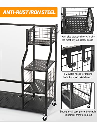 - 【Optimal Golf Storage Solution】: This golf rack features 4 movable hooks for hanging, 3 storage shelves for golf gears like sports shoes, hats, gloves or golf trunk, and 1 enclosed net shelf for golf balls and small accessories. Additionally, it has a primary storage area that can hold 2 standard golf bags. Perfect for organizing all your golf equipment indoors and outdoors to save space.