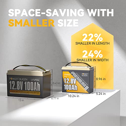 - 【22% Smaller in Length & 24% Smaller in Width】Power Queen 12V 100Ah Mini LiFePO4 Battery is 22% Smaller in Length & 24% Smaller in Width than Power Queen 12V 100Ah LiFePO4 Battery. Power Queen 12V 100Ah Mini LiFePO4 Battery’s dimension is L10.24in*W5.24in*H8.96in while Power Queen 12V 100Ah LiFePO4 Battery’s dimension is L13in*W6.82in*H8.84in. Power Queen 12V 100Ah Mini Lithium Battery takes up less space, which is ideal for RV and marine energy storage.