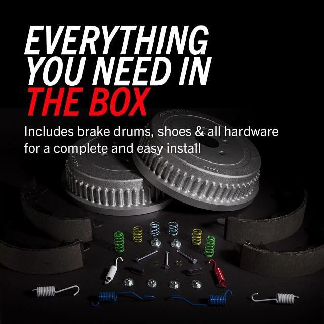 - Rear Drum and Shoe Kit Includes: 2x Rear Brake Drums + 1x Rear Brake Shoe Set [ w/Hold Down and Adjuster Kit]