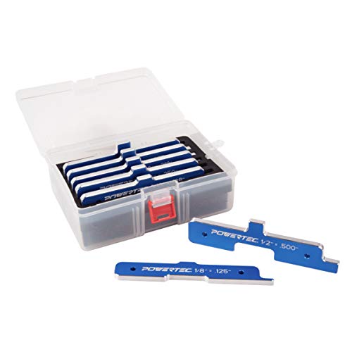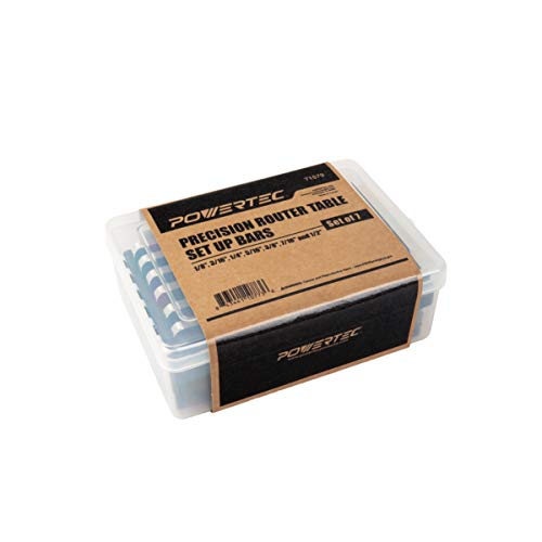 Details: "Introducing the Router Table Set Up Bars by POWERTEC. These set-up bars are designed to help you set the bit or blade height of your woodworking tool with high precision. Featuring an impressive range of seven specified sizes (1/8” to 1/2”) in 1/16” increments, this will help eliminate the need for time consuming measuring and/or repeated test cuts that disrupt workflow. They are designed to work with your router table and table saw applications, but offer exceptional accuracy for many of your dados, jigs, fixtures and so much more. Common Functions Set the depth of the bit on a router table. Set blade depth on a table saw. Checking the depth of a cut. Set the distance between the blade and fence on a table saw. Set the distance between the router bit and fence. Included Bar Sizes 1/8"" | 3/16"" | 1/4"" | 5/16"" | 3/8"" | 7/16"" | 1/2"" (Please Note: The dimensions are conveniently printed of each gauge.) Additional Bar Specifications Color: Blue Length: 5-7/8” Thickness: 1/4” Varied Width: 1-5/64” to 49/64” Package Contains 7pc Router Table Set Up Bars Set Storage Case Manual "