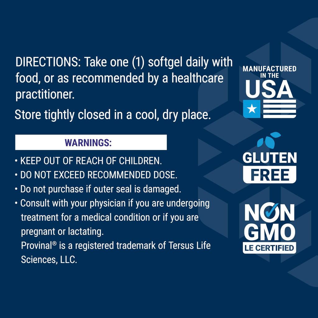 Details: Provinal® Purified Omega-7 is a novel formula for cardiovascular health support. It contains palmitoleic acid, a fatty acid derived from highly concentrated marine oil that complements omega-3s by helping to maintain already healthy total cholesterol, LDL, HDL and triglyceride levels. Studies have found that palmitoleic acid can also help maintain already normal C-reactive protein levels. Provinal® Purified Omega-7 contains 30 gluten-free softgels, enough for a one-month supply. This formula is made with 100% non-GMO ingredients and is manufactured in the USA.