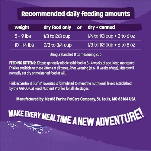 Details: Give your cat all her favorite tastes combined in one sensational serving of Purina Friskies Surfin' and Turfin' Favorites dry cat food. Chicken, Ocean Whitefish, Salmon and Filet Mignon flavors offered in interesting shapes keep her excited about her meals. You can feel good about the essential vitamins and minerals found in this tasty dry cat food that supports her whole-body health. Essential fatty acids help support her healthy skin and coat, while vitamin A and taurine support clear, healthy vision. Antioxidants in this dry cat food promote a healthy immune system. The crunchy texture of our kibble cat food helps to keep her teeth clean. This tempting recipe can follow your cat from her cuddly kitten days to her playful adult years because the formula provides 100 percent complete and balanced nutrition for all life stages. Offer up a hearty helping of this Purina Friskies dry cat food every day, and watch as your feline friend gleefully nibbles her way to the bottom of her dish.