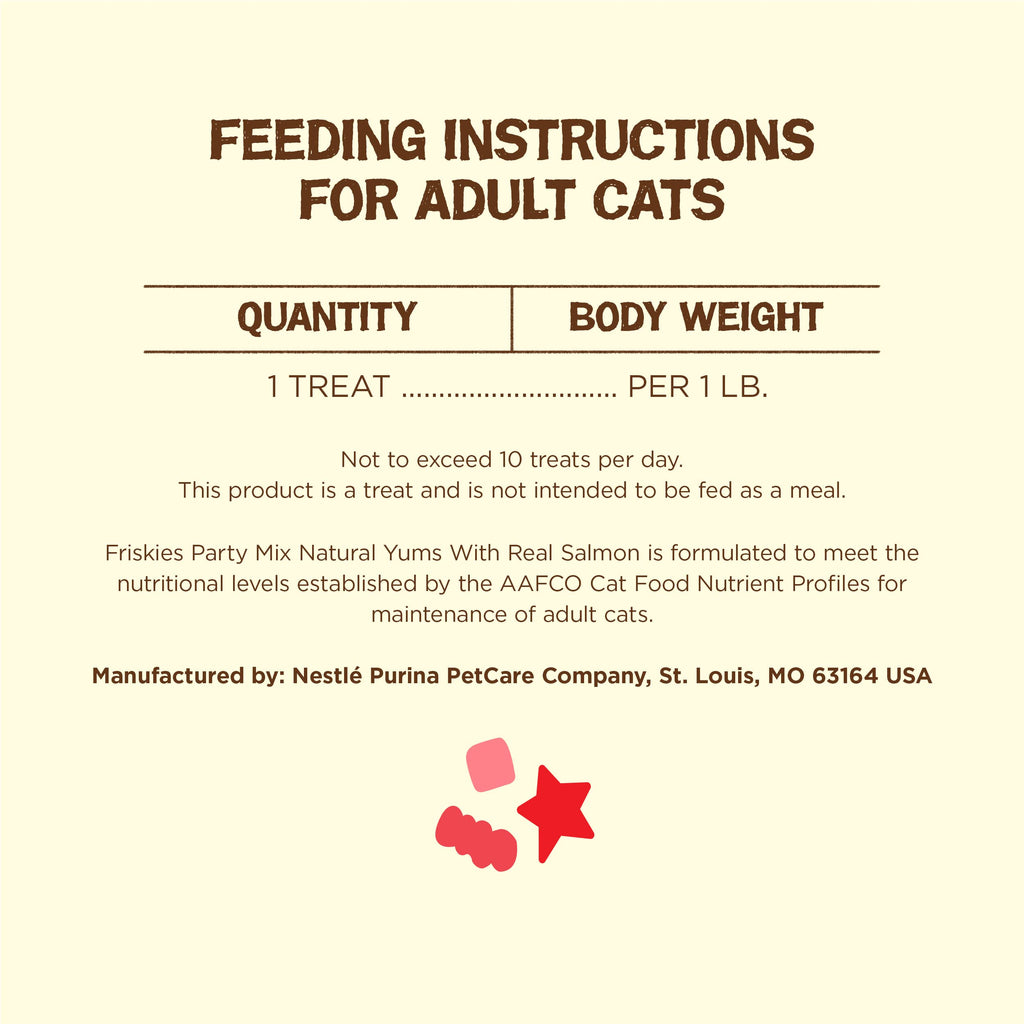 Details: Celebrate your special relationship when you offer your cat Purina Friskies Party Mix Natural Yums Salmon With Added Vitamins & Minerals adult cat treats. Made with real fish as the #1 ingredient, these wholesome treats for adult cats give your feline friend the mouthwatering seafood flavor she craves. These tasty treats are the purr-fect way to pamper your kitty because they contain 100 percent complete and balanced nutrition for adult cats. Keep her happy between meals with one or two treats, or dole out a few pieces along with her dinner to show your love. Fun shapes hold her attention as she crunches away at these yummy treats, which are made without artificial colors, flavors or preservatives. Tear open a pouch of Purina Friskies Party Mix Natural Yums With Real Salmon With Added Vitamins & Minerals adult cat treats to delight your precious pet with tasty flavor and high-quality ingredients.