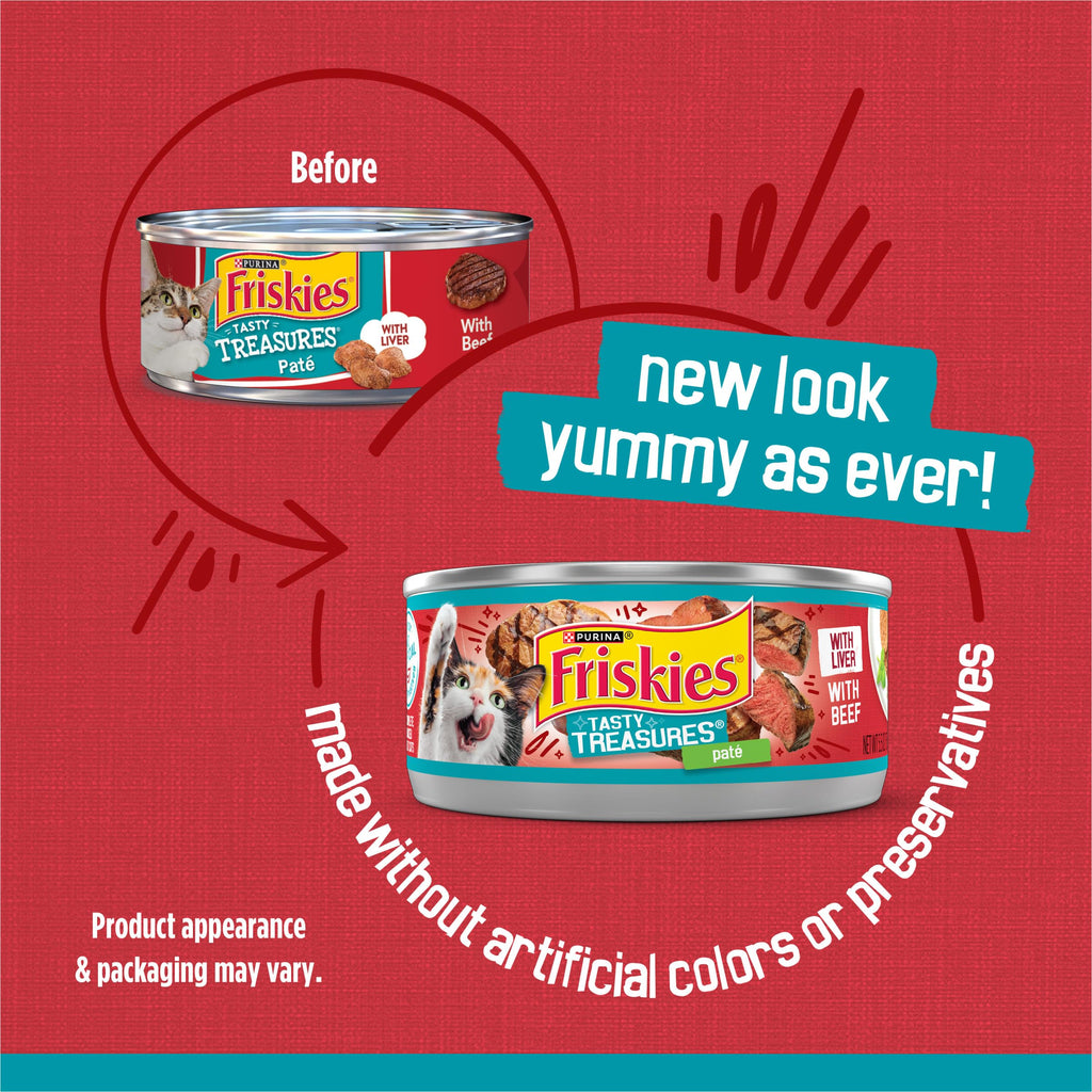 Details: Provide your cat with a mouthwatering dining experience full of the meaty flavors she loves with Purina Friskies Tasty Treasures With Liver and Beef Pate wet cat food. Delectable beef and liver flavors combine to create a sensational taste, and the smooth pate texture is soft and easy to nibble. We craft this flavorful recipe with high protein to help support your cat's strong muscles. The enticing aroma that wafts through the air as you open the can lets her know something delicious is about to appear in her dish. Each serving of thiswet food supplies your adult cat with 100 percent complete and balanced nutrition plus essential vitamins and minerals to support her overall health and well-being. Show your favorite feline just how much she means to you when you fill her dish with this Purina Friskies Tasty Treasures recipe. We proudly manufacture this wet cat food entree in our Purina-owned U.S. facilities and package it in a recyclable can for convenient storage.