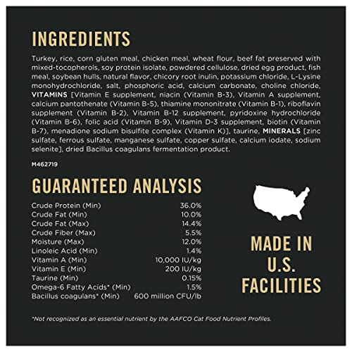 Details: Keep your indoor cat's special nutritional needs in mind while helping to control hairballs with Purina Pro Plan Indoor Hairball Turkey and Rice Formula adult dry cat food. With high-protein nutrition to help your cat maintain a healthy weight, this Purina cat food for indoor cats delivers high-quality protein sources, including real turkey as the first ingredient. Natural prebiotic fiber nourishes specific intestinal bacteria to support her digestive health. We carefully choose every ingredient in this Purina dry cat food to serve a specific purpose and leave out artificial colors and flavors, so you can feel good about the nutrition you give your cat. This dry cat food delivers essential nutrients, including antioxidants to help support her healthy immune system and omega-6 fatty acids and vitamin A to nourish her skin and coat. Our cat dry food contains 100 percent complete and balanced nutrition for adult cats. Nurture your cat's natural greatness with this Purina cat food formula.