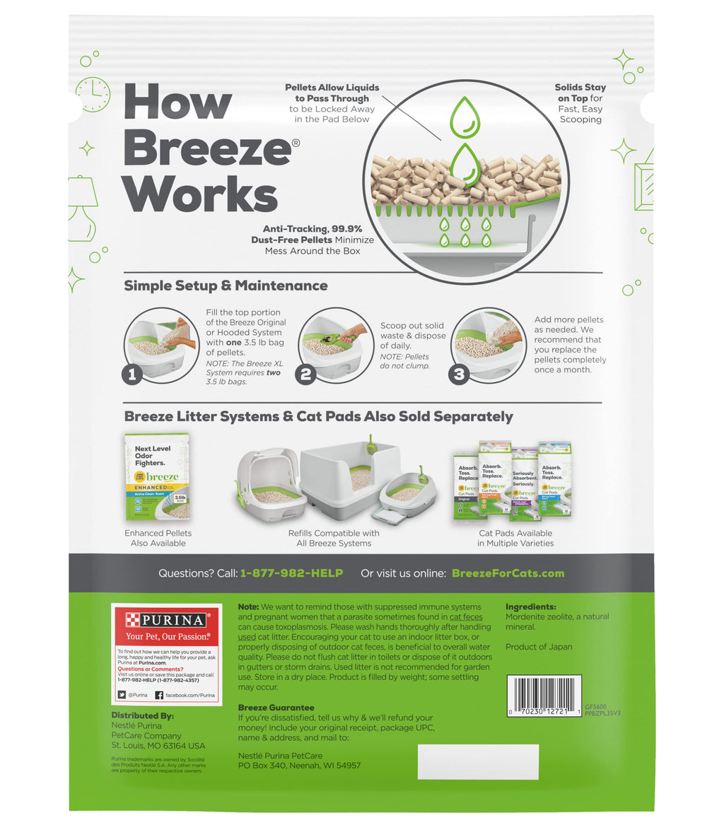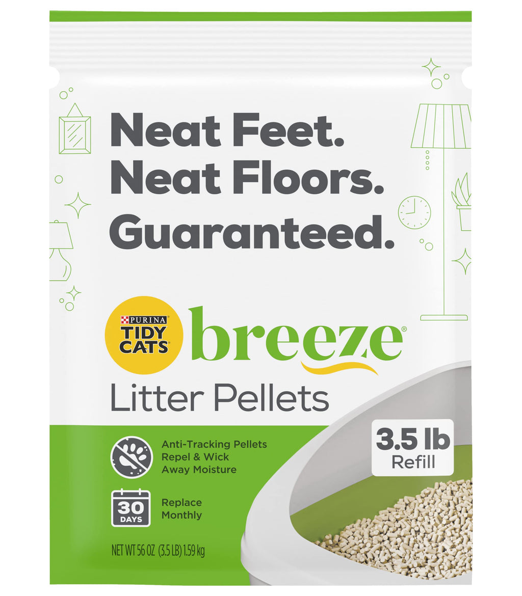 Details: Purina Tidy Cats Breeze Litter Pellets, 3.5 LB Refill Pouch: Anti-tracking pellets that wick away moisture; Replace monthly. Control odor and make cleaning up your cat litter box a hassle-free task with this Purina Tidy Cats Breeze cat litter pellets refill. Our unscented litter pellets are designed to work with the Tidy Cats Breeze cat litter system. The low tracking cat litter pellets allow liquid to pass through, leaving solid waste on top. This makes scooping your Breeze cat litter system quick and easy. The 99.9 percent dust free cat litter pellets pour cleanly into your cat litter box without leaving a mess behind. The kitty litter is formulated for multiple-cat households, so your feline family is happy and willing to use their Breeze litter system. Featuring outstanding odor control, this mess-minimizing pellet litter helps you maintain a fresh-smelling house. Check cat litter box maintenance off your to-do list with these innovative anti-tracking Breeze refill litter pellets. Neat Floors. Neat Feet.