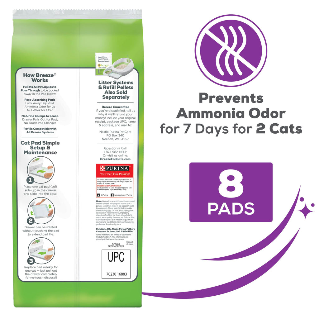 - Tidy Cats Breeze pads are designed to last and control ammonia odor for 7 days for two cats, each bag includes 8 pads