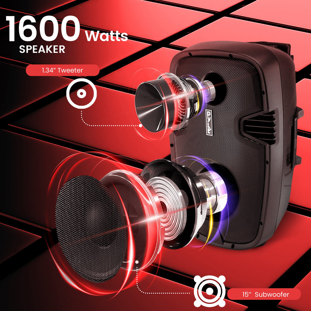 - POWERFUL AND PORTABLE: This Compact and High Powered 1600 Watt Karaoke PA Sound System by Pyle is equipped with 15 inch Subwoofer and 1.34'' Tweeter for Full Range Stereo Sound Reproduction and its handles and wheels make travel easy.
