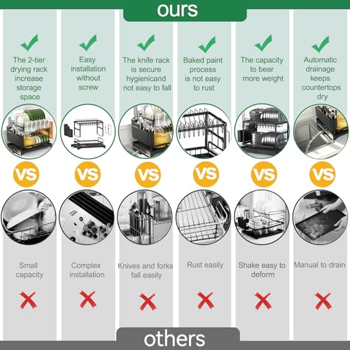 - Versatile Storage Solutions:Elevate your dish drying experience with our 2 tier dish drying rack. The two-tier design sets our dish drying rack apart, with the upper level featuring a full-size layout that surpasses most competitors in capacity. Thoughtful features on the side of the dish racks for kitchen counter give you ample drying space.