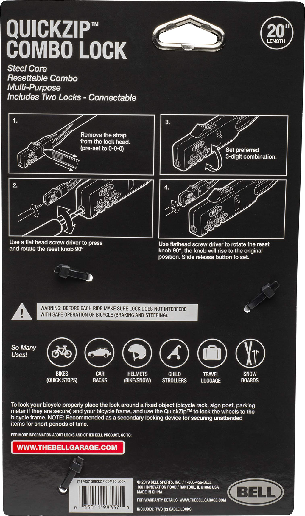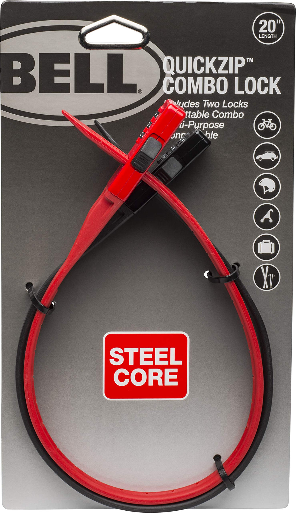Details: The new QuickZip 2-pack is a cutting edge, steel core, zip-tie style combo lock. Equipped with a 3-digit resettable combination function and 20” of locking length, these lightweight, easy-carry locks have more potential than meets the eye. The 2-pack includes one red and one black lock to be used separately or daisy-chained together for even greater locking length. Whether it’s for your bike, car rack, helmet, child stroller, travel luggage, or snowboard, if convenience is your priority, then these locks are for you.