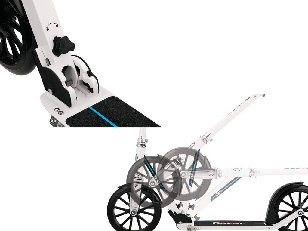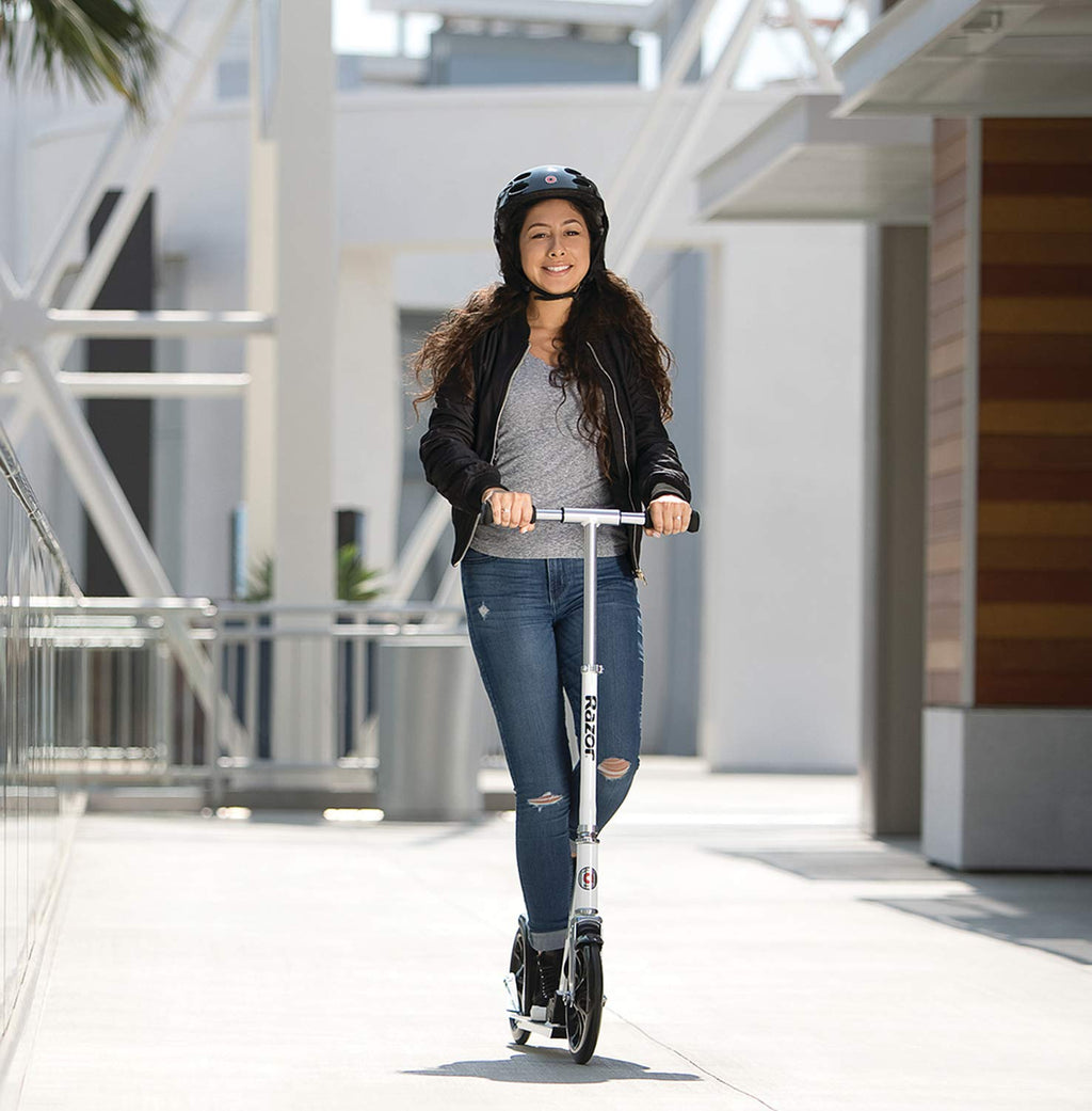 Details: You’re never too tall to ride! The Razor A6 kick scooter was designed and built specifically for taller riders, featuring handlebars that adjust to an incredible height of 42” (1067 mm), an extra-long deck, and ultra-sized, 10” (254 mm), urethane wheels. Built to last with a super-strong aluminum frame and including Razor’s patent-pending, anti-rattle technology, the A6 offers the smoothest ride for taller riders.