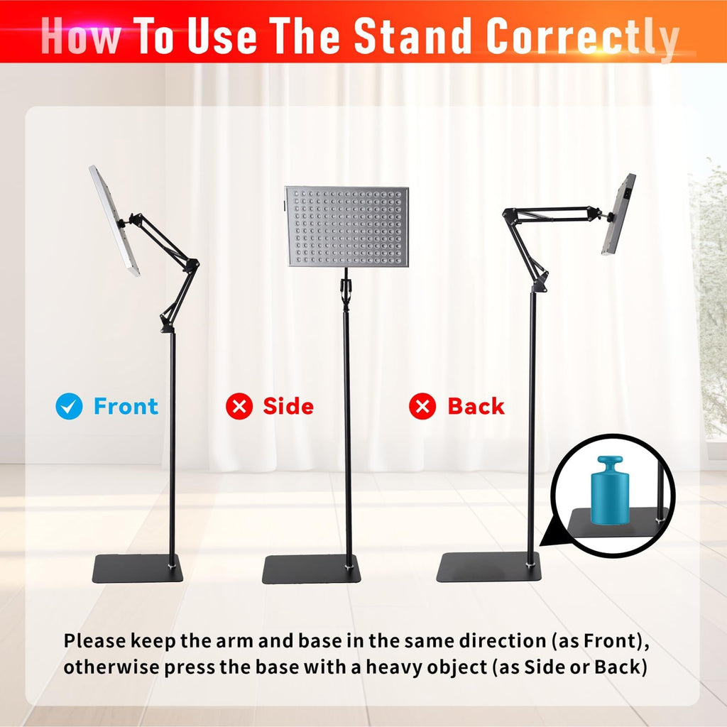 - Easy to Install and Stable: It easily takes 3 steps to install the red light therapy panel for body without any extra tool. 1.2Kg heavy and wide base makes the red light therapy lamp stands more stable and reliable than traditional tripods , so you don't have to worry about tilting or falling. With adjustable arm and 360° rotating ball on the back of the infrared light therapy, you can adjust any angle for different positions and postures, such as lying, sitting, standing and so on.