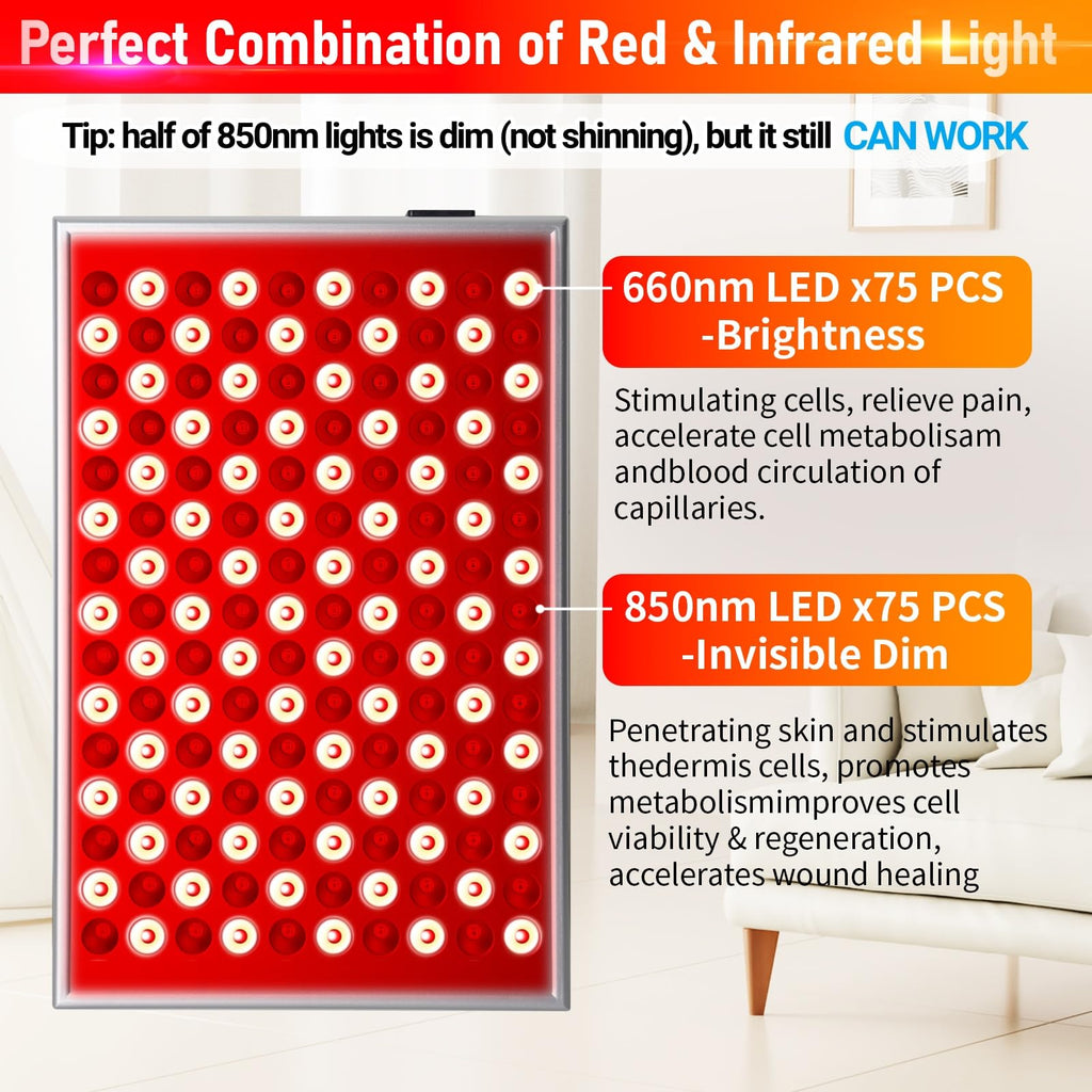 - Great Effect with Perfect Combo: Our red light therapy panel includes deep 660nm(75pcs) and near infrared 850nm(75pcs) which are the best wavelength combination. 660nm red light can reach deep layers of the skin so that it stimulates ce-llu-lar repair and increases circulation.850nm NIR light can pen-etra-te and generate ther-mal effects, promote blo-od circul-ation, enhance m-etab-olism, and improve c-ell vit-ality.This red infrared light therapy is not a Heat Lamp!