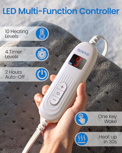 - 10 Heat Settings & 2 Hours Auto-off Timer: Control how warm you want the pad to get with the attached handheld controller. Choose your heat with 10 temperature settings ranging from 104℉ to 140℉. Enjoy a greater peace of mind with a built-in timer that safely switches off the controller after 2 hours has elapsed. Rated Power: 85w, 120v.