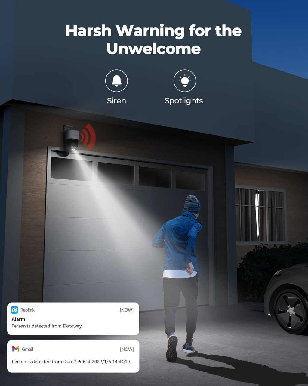- INSTANT ALERTS: Once any suspicious motions are detected, spotlights and sirens will be triggered, and push/email notifications will be sent to your device. Feel safe all the time.