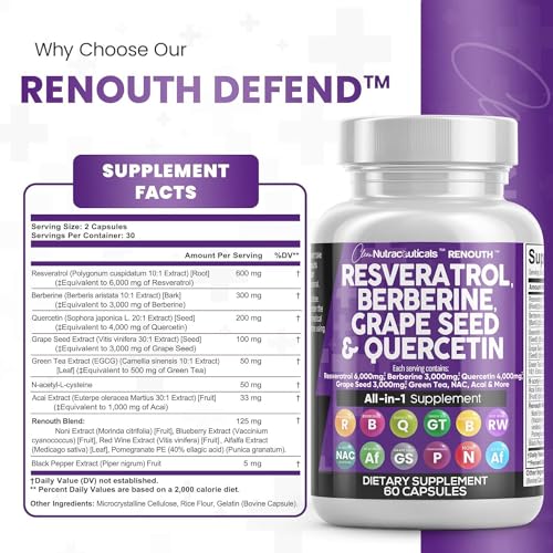 - Introducing the Renouth All In One Supplement - In addition to containing Grapefruit Seed Extract Capsules, our formula also contains a whopping equivalent of 6000mg of Quercetin Powder. This supplement could be a powerful alternative to Resveratrol Liquid, Berberine Tea, Grape Seed Oil, Quercetin Gummies and Resveratrol Gummies. Not your typical Resveratrol Serum, Quercetin 1000mg, Berberine 1500mg, Trans Resveratrol Supplement or Berberine HCL.