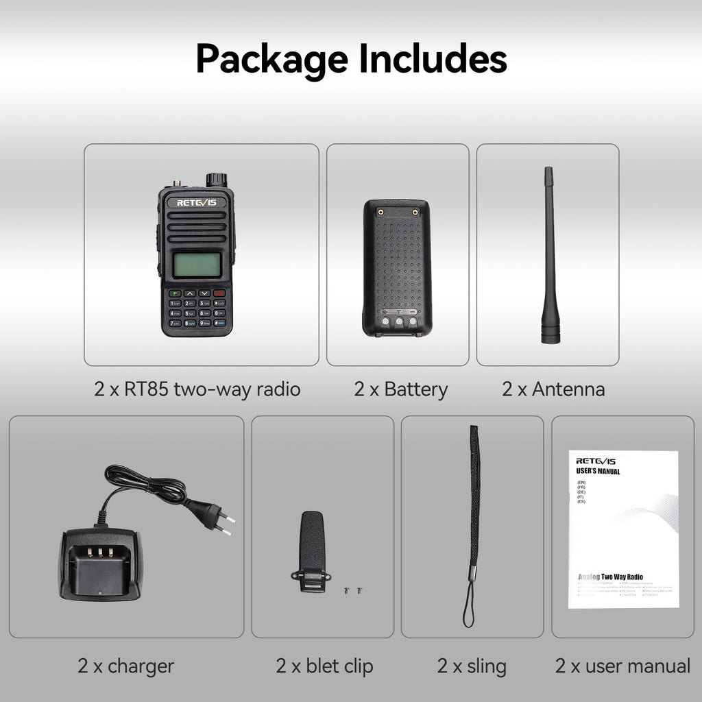 - Long Range Two Way Radio; the RT85 walkie-talkie adopts a high-power design with a wide signal transmission range and strong penetration; it can provide clear and loud audio even in densely populated neighborhoods; it can also be connected to a repeater to extend the communication range