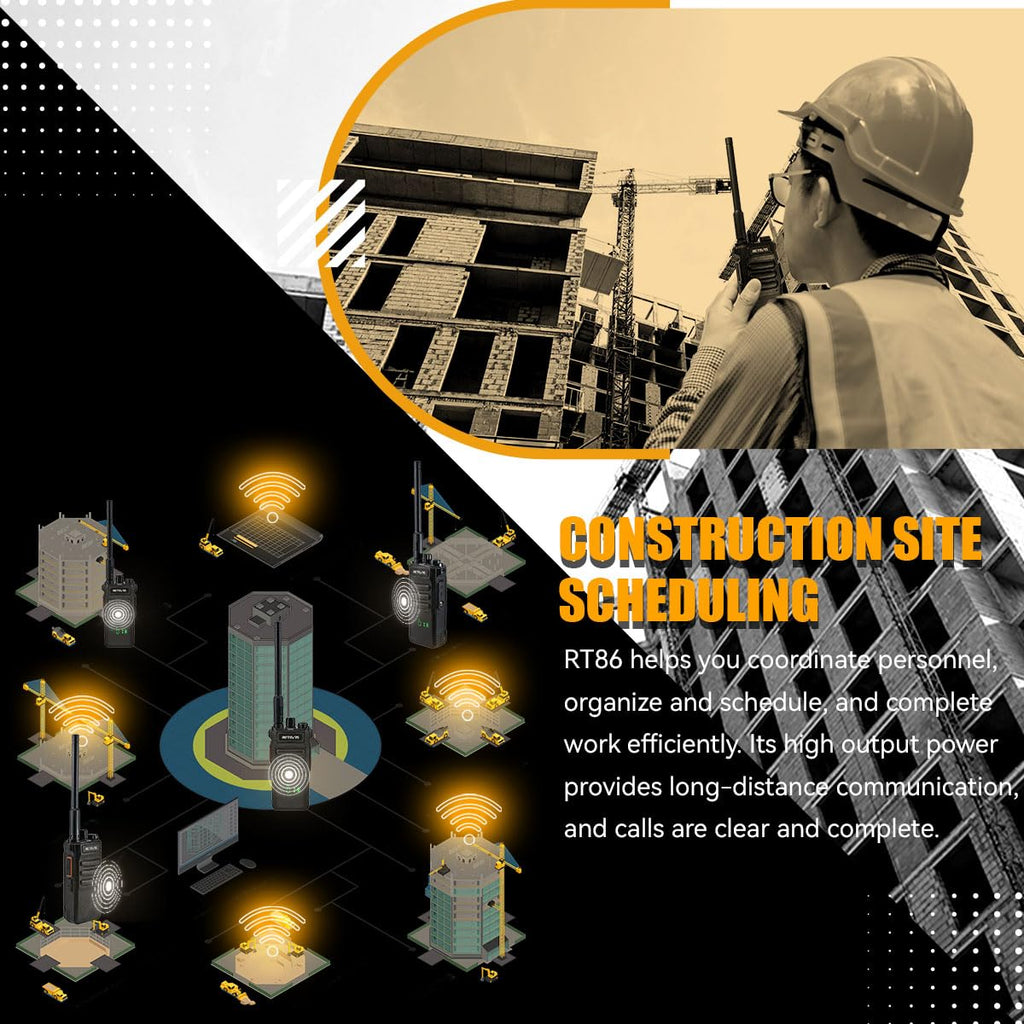 - Long range walkie talkies; with its high power output and high gain antenna; the RT86 walkie talkie has these two key conditions that shape long distance calls; so concrete complexes have very limited distance attenuation to the RT86 walkie talkie; and you can hear loud and clear audio; deal for use in high-rise buildings and warehouses