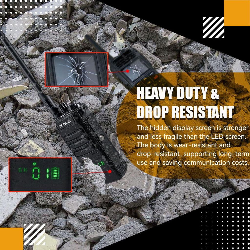 - Rugged walkie-talkies; the hidden screen design is more durable than the fragile LCD screen and clearly displays the information you need; the heavy-duty shell design extends the service life; and the call will not be interrupted even if it is accidentally dropped from a height of 2m