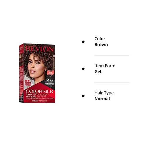 Details: Revlon ColorSilk Hair Color [43] Medium Golden Brown 1 ea (Pack of 6) - Revlon ColorSilk's beautiful color is the hair color. The ammonia-free hair color delivers 100% gray coverage. Achieve rich, long-lasting hair color and a radiant shine at home. Revlon 3d color gel technology delivers natural-looking, multi-tonal color from root to tip providing definition and boosting your hair’s dimension. Now enriched with keratin and silk amino acid, color silks ammonia-free formula leaves your hair in better condition than before you ever colored it. Directions: Please follow the box instructions closely, but here are a few important points you might want to know right now about this hair color kit: For the best results, apply the hair color first to your roots in small sections (about 1/8" each). The typical leave-on time for all-over color is 25 minutes, but if you have particularly stubborn grays, add 5 more minutes (so 30 minutes total). Using Ultra Blonde shades 03, 04, or 05? Add an additional 20 minutes to the usual time frame (so 45 minutes total on your head).