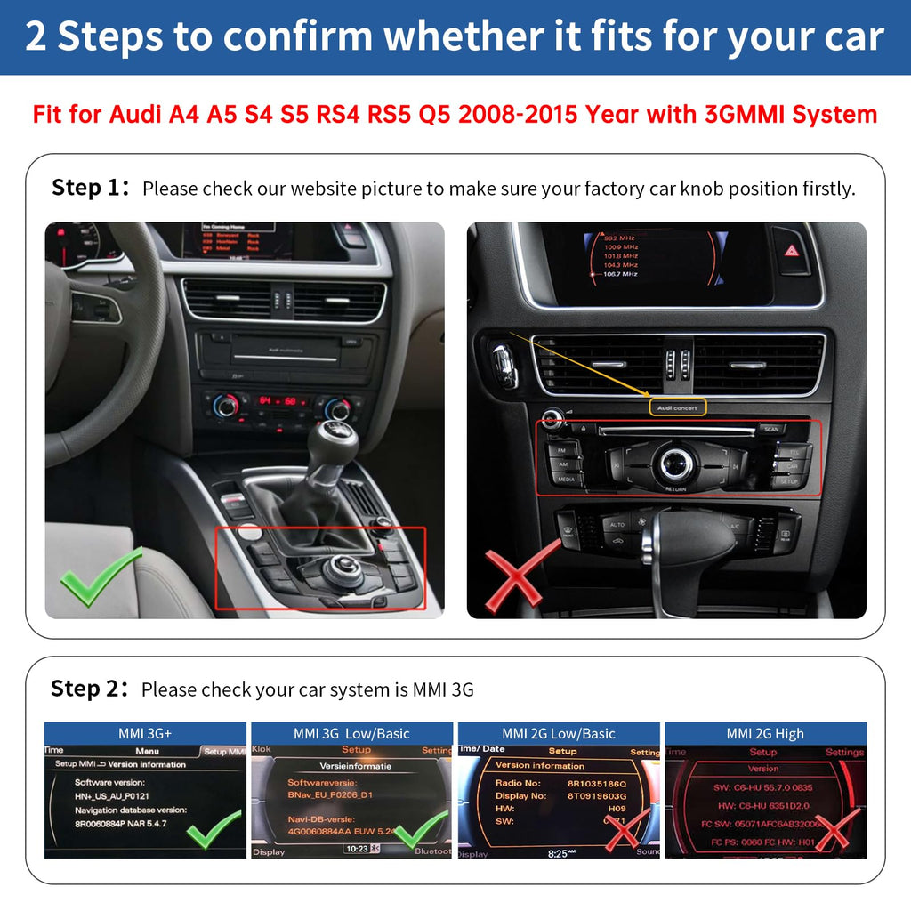 - Suitable vehicle: Road Top Wireless Carplay Retrofit Kit Decoder fit for Audi A4 A5 S4 S5 RS4 RS5 Q5 2008-2015 with 3GMMI System. Only fit for MMI 3G System.Not fit for MMI 2G System.Especially for 2009 car, please check our website picture to make sure your factory car knob position firstly