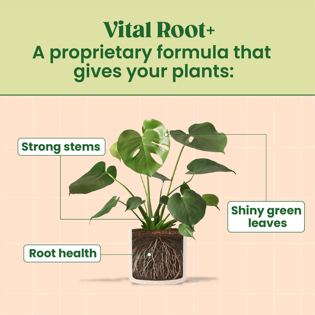 Details: Bring your favorite houseplants back to life with Vital Root+ Liquid Root Stimulator, a specially formulated root supplement designed to fight root rot and promote healthy happy leaf growth. Great with fiddle leaf figs, pothos, philodendrons, or other indoor plants, our fast-acting formula works within 24 hours to strengthen natural plant defenses and prevent further root damage.