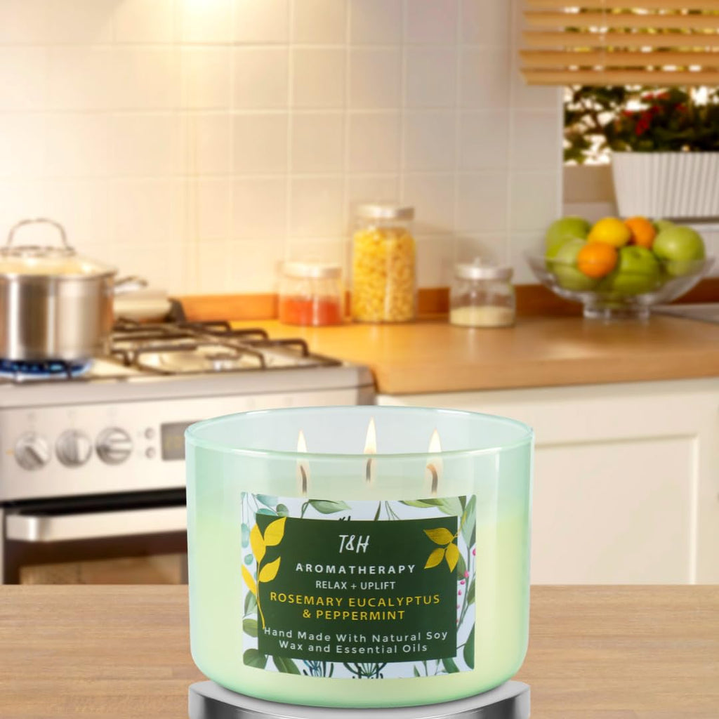- π₯ Triple Wick Scented Candle: Immerse yourself in the invigorating aroma of our Rosemary Eucalyptus and Peppermint candle. Crafted with care from 100% natural soy wax and infused with delicate undertones of lavender and thyme, this 15.8 Oz candle with its three cotton wicks is handcrafted to release a harmonious fragrance, creating a serene and refreshing ambiance that will awaken your senses and uplift your space.