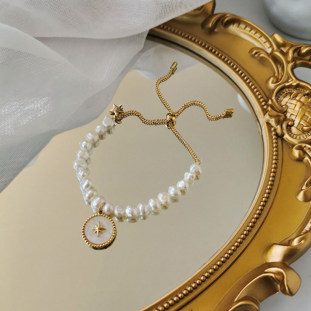 The size of the bracelet: 9*0.05 in. The weight: 0.28 oz. Made of high-quality materials including alloy and pearls.