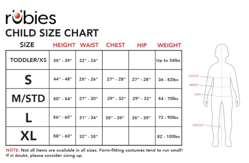 - IMPORTANT: Costumes are not sized the same as clothing, read the Rubie’s Child Size Chart and measure child before making selection