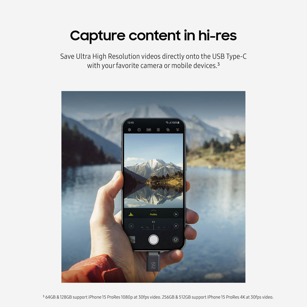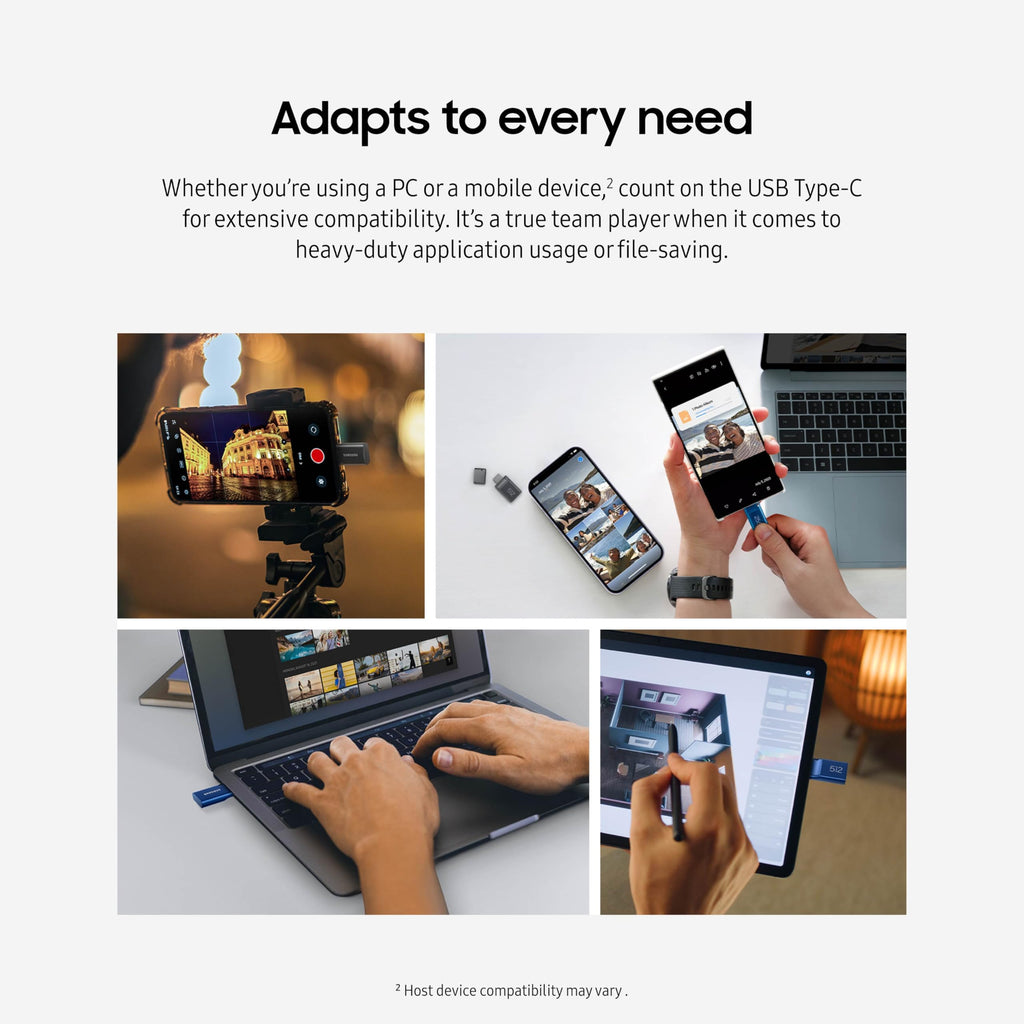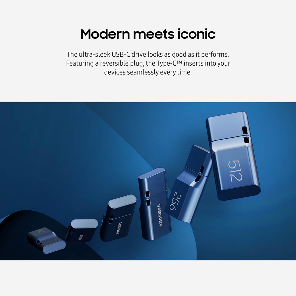Details: This sleek drive is supported by Samsung NAND flash and is incredibly compact to fit in the palm of your hand. Count on reliable performance and fast transfer speeds while staying compact. No need to choose between performance and reliability. Experience a fast, powerful flash drive that transfers 4GB files in just 15 seconds with up to 300MB/s USB 3.2 Gen 1 read speeds and is backward compatible with USB 3.0/2.0. *USB-C is compatible across devices, including laptops, tablets, phones and cameras, with enough space for 15,930 photos or maximum 3 hours of 4K video. With up to 512GB of storage space, this pocket-sized thumb drive comes in handy wherever you go. ** Files stay secure, no matter the terrain. Samsung's flash memory technology makes the Type-C™ a trustworthy drive to store your valuable data. It's waterproof, shock-proof, magnet-proof, temperature-proof, and X-ray-proof body, plus it's backed by a 5-year limited warranty. *** Experience the performance and reliability that you can only get from the world's number one brand for flash memory since 2003. All firmware and components, including Samsung's world-renowned DRAM and NAND, are produced in-house, allowing end-to-end integration for quality you can trust. For specific details on warranty, please visit: www.semiconductor.samsung.com/consumer-storage/support/warranty.